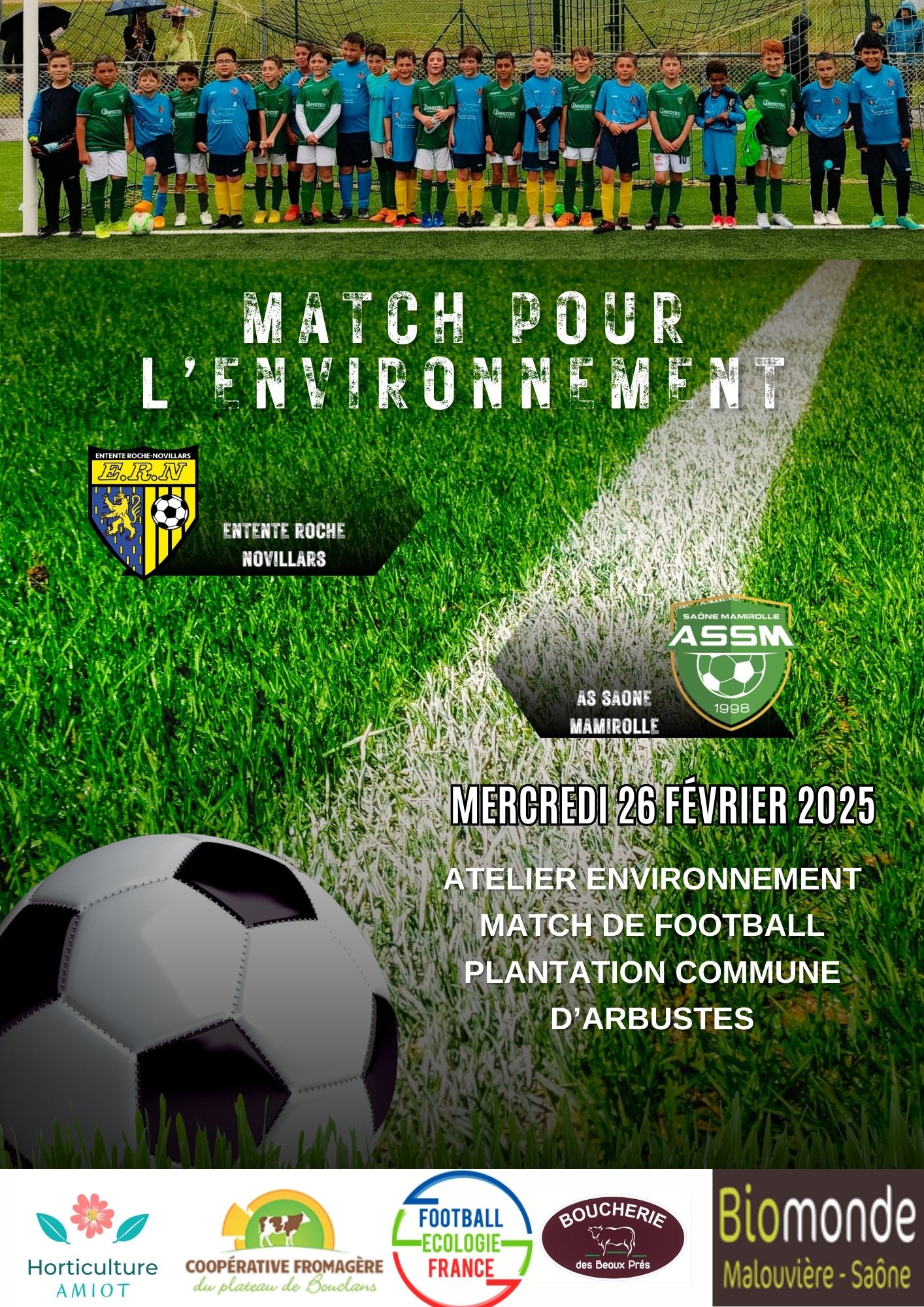 Le mercredi 26 février 2025 à partir de 14h à Novillars, les clubs de l'Entente Roche-Novillars et de l'AS Saône-Mamirolle organise un match pour l'environnement !
